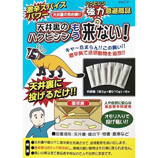 『天井裏のハクビシもう来ない!』は強烈な激辛スパイスが袋にたっぷり入っていて、天井裏や床下に放り込むだけで、ハバネロ等の刺激に堪らず逃げ出して行きます。