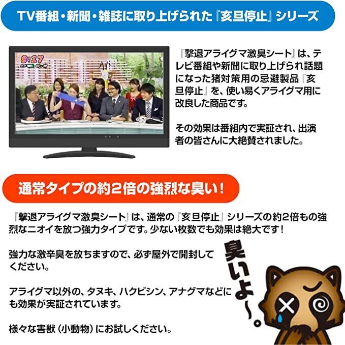 『撃退アライグマ激臭シート』はTV番組・新聞・雑誌に取り上げられて大変話題になった『亥旦停止』シリーズ製品です。