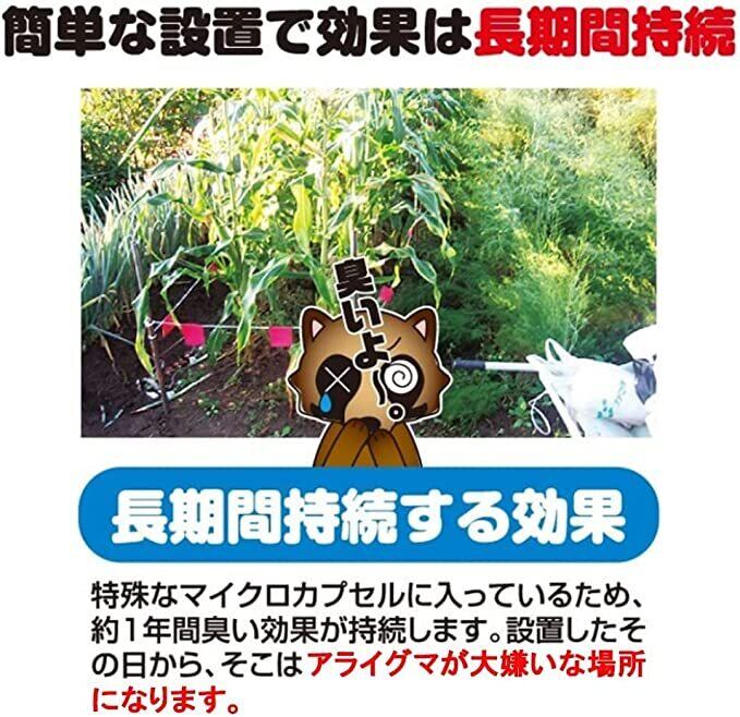 長期間効果が持続!特殊な微細マイクロカプセルに入っているため、約1年間効果が持続します。設置したその日から、そこはアライグマの大嫌いな場所になります。