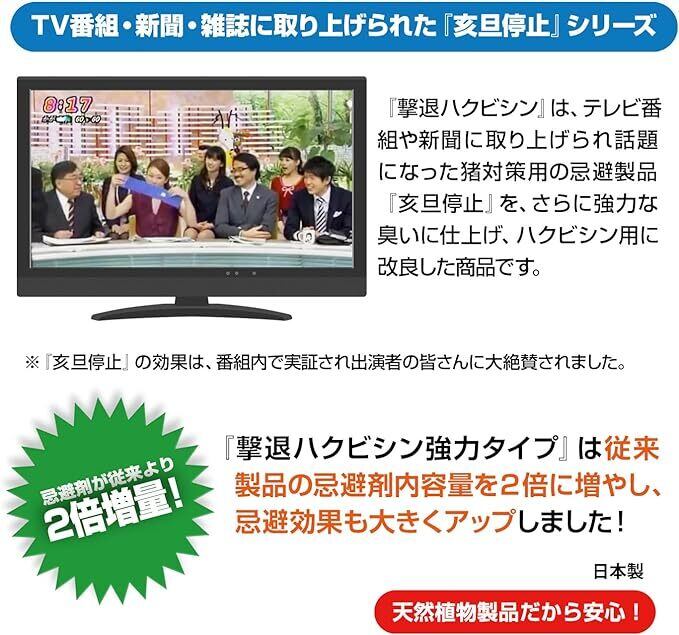 TV番組等で紹介されて話題になったイノシシ忌避剤『亥旦停止』(大型動物用)の忌避効果を約2倍に強化してハクビシン用に改良した従来の『撃退ハクビシン』が好評でしたが、新発売の【撃退ハクビシン強力タイプ】は、忌避剤の内容量を『撃退ハクビシン』よりさらに2倍に増量し、ニオイ効果が強力にアップしました!