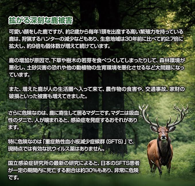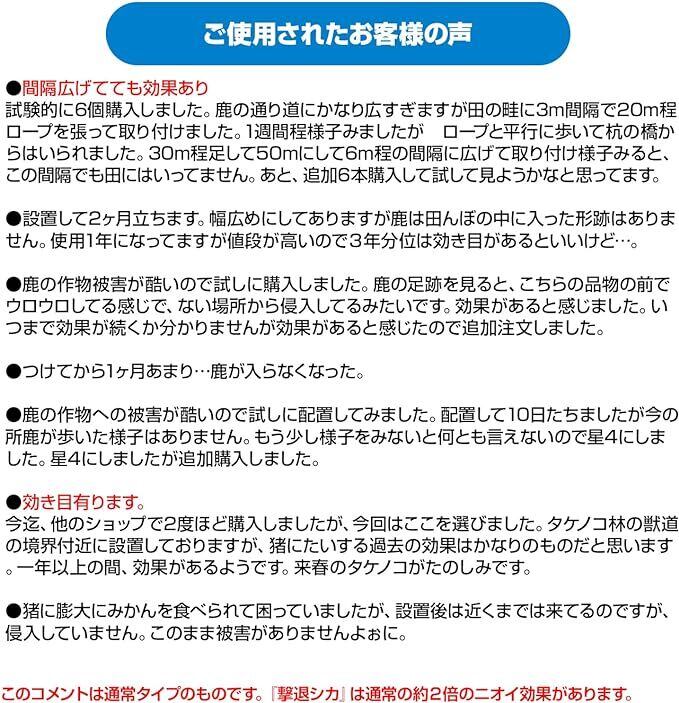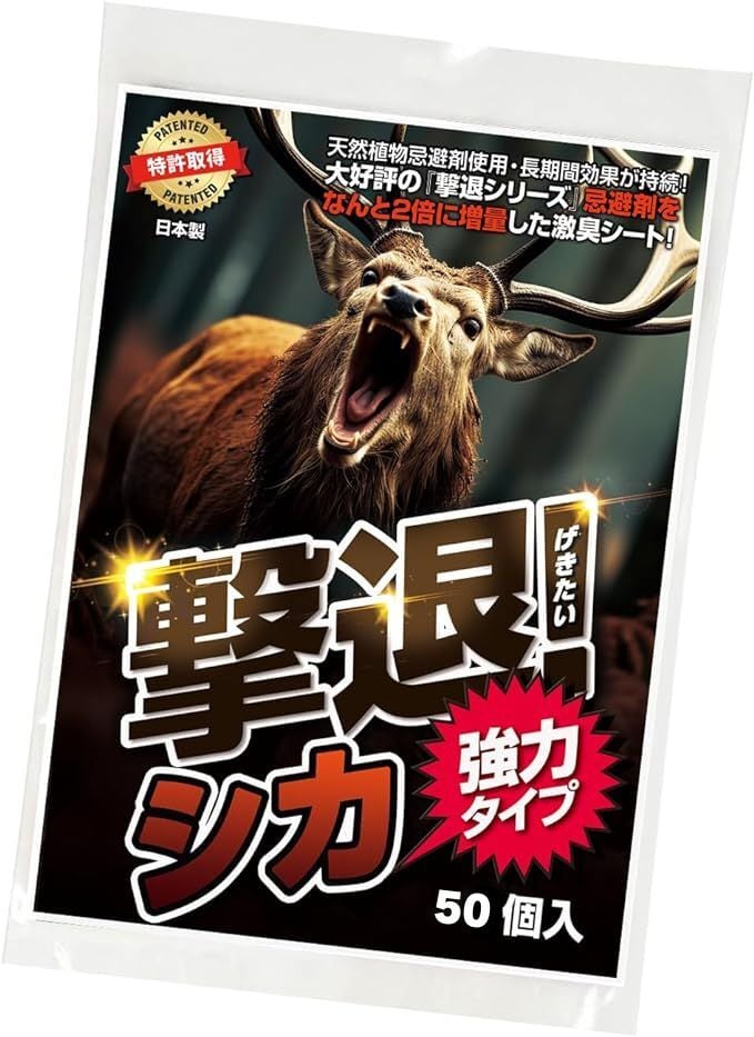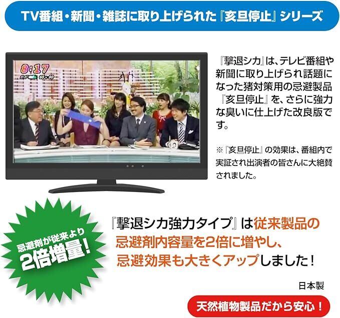 TV番組等で紹介されて話題になったイノシシ忌避剤『亥旦停止』(大型動物用)の忌避効果を約2倍に強化してシカ用に改良した従来の『撃退シカ』が好評でしたが、新発売の【撃退シカ強力タイプ】は、忌避剤の内容量を『撃退シカ』よりさらに2倍に増量し、ニオイ効果が強力にアップしました!